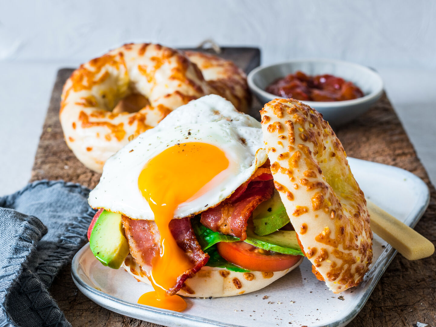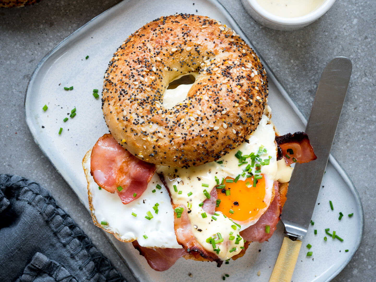 It's bacon, egg, and hollandaise sandwiched between two slices of garlicky, Everything goodness. Need we say more?
