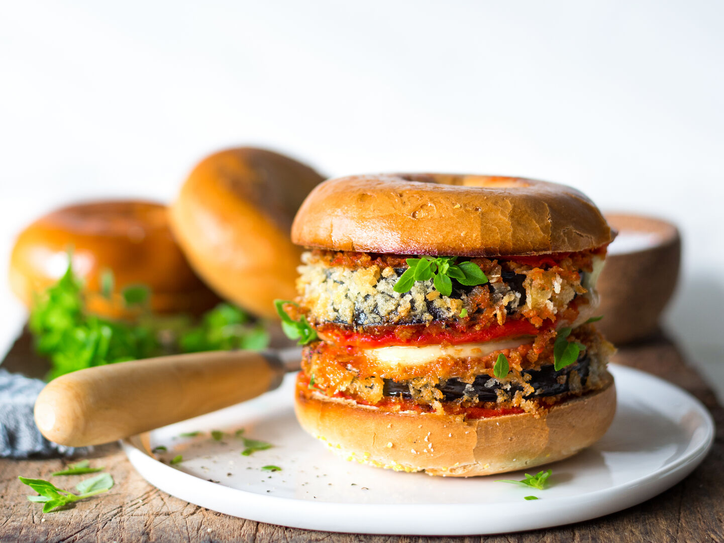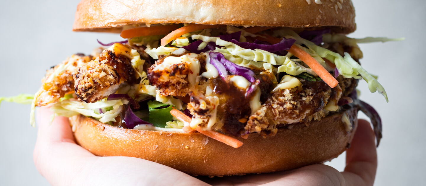 Who says vegetarians can't have fun? Crispy panko crumbed eggplant, fresh basil pesto & melty mozzarella.