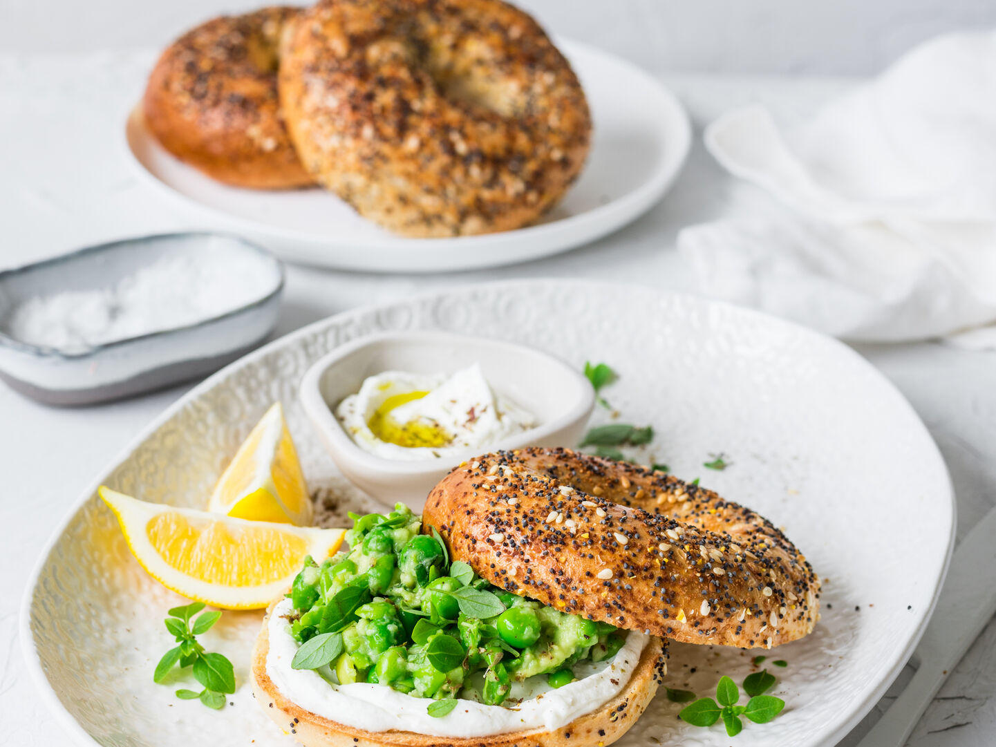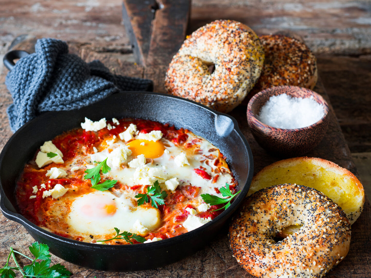 Turkish eggs with a side of Everything bagels - breakfast has never tasted so good.