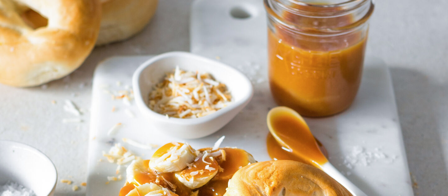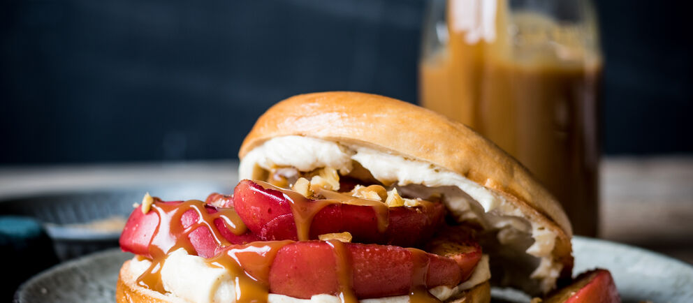 Spread with a blend of vanilla, cinnamon & cream cheese, this sweet tooth's dream is then embellished with apple slices & drenched in salted caramel.