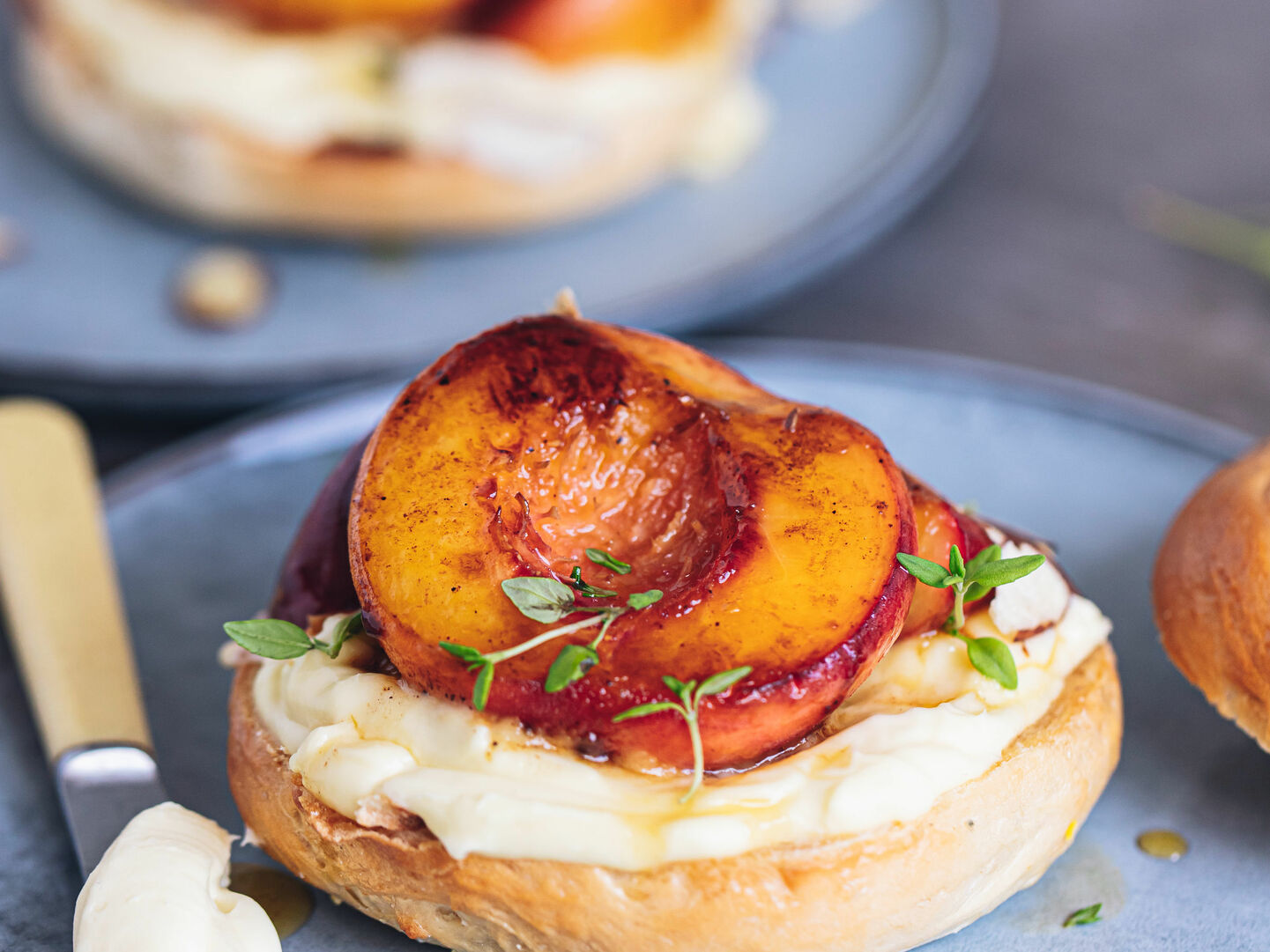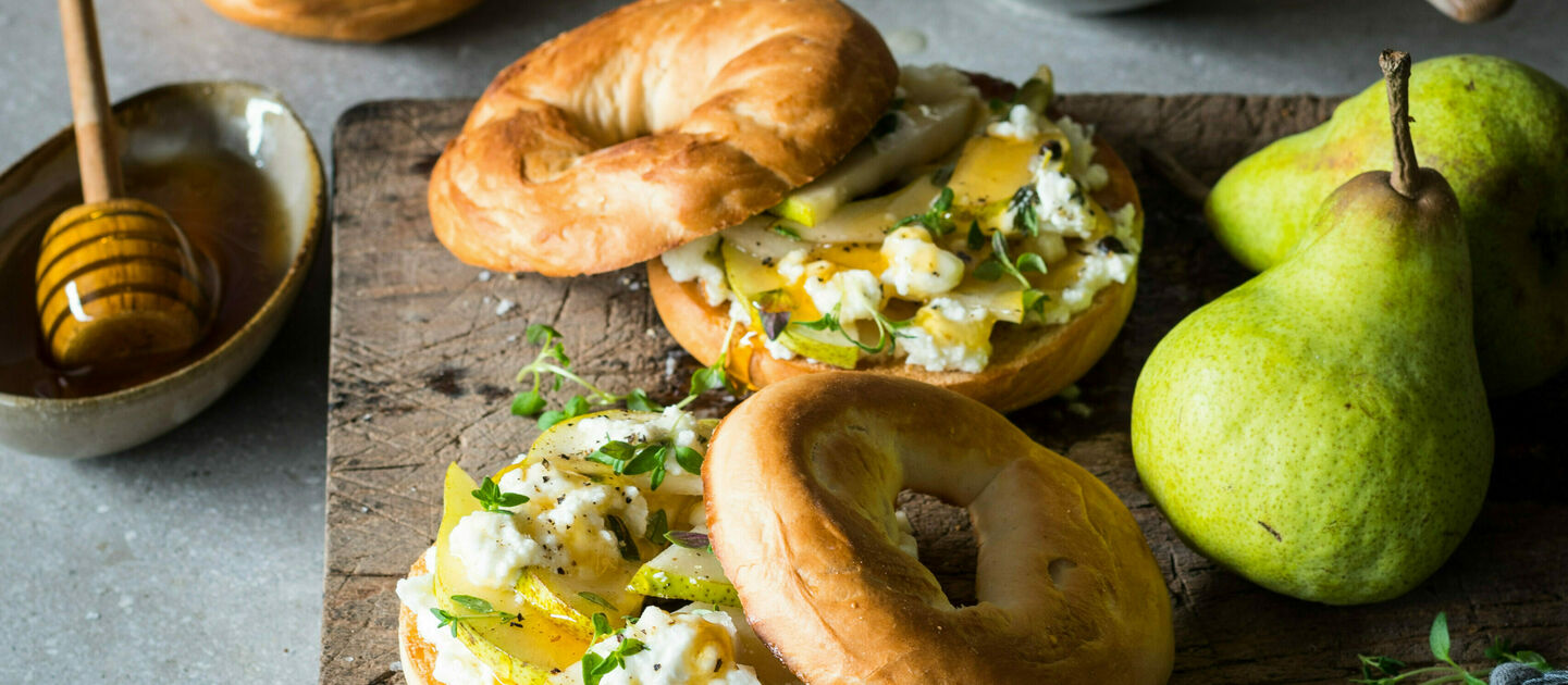 Seasonal fresh pear, creamy goat's cheese, and a drizzle of runny honey. Forget the cheese board get the bagels out instead!