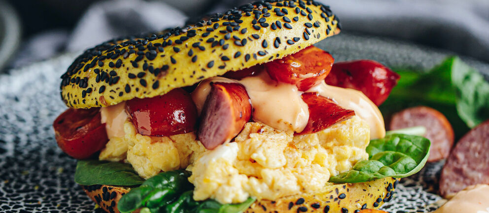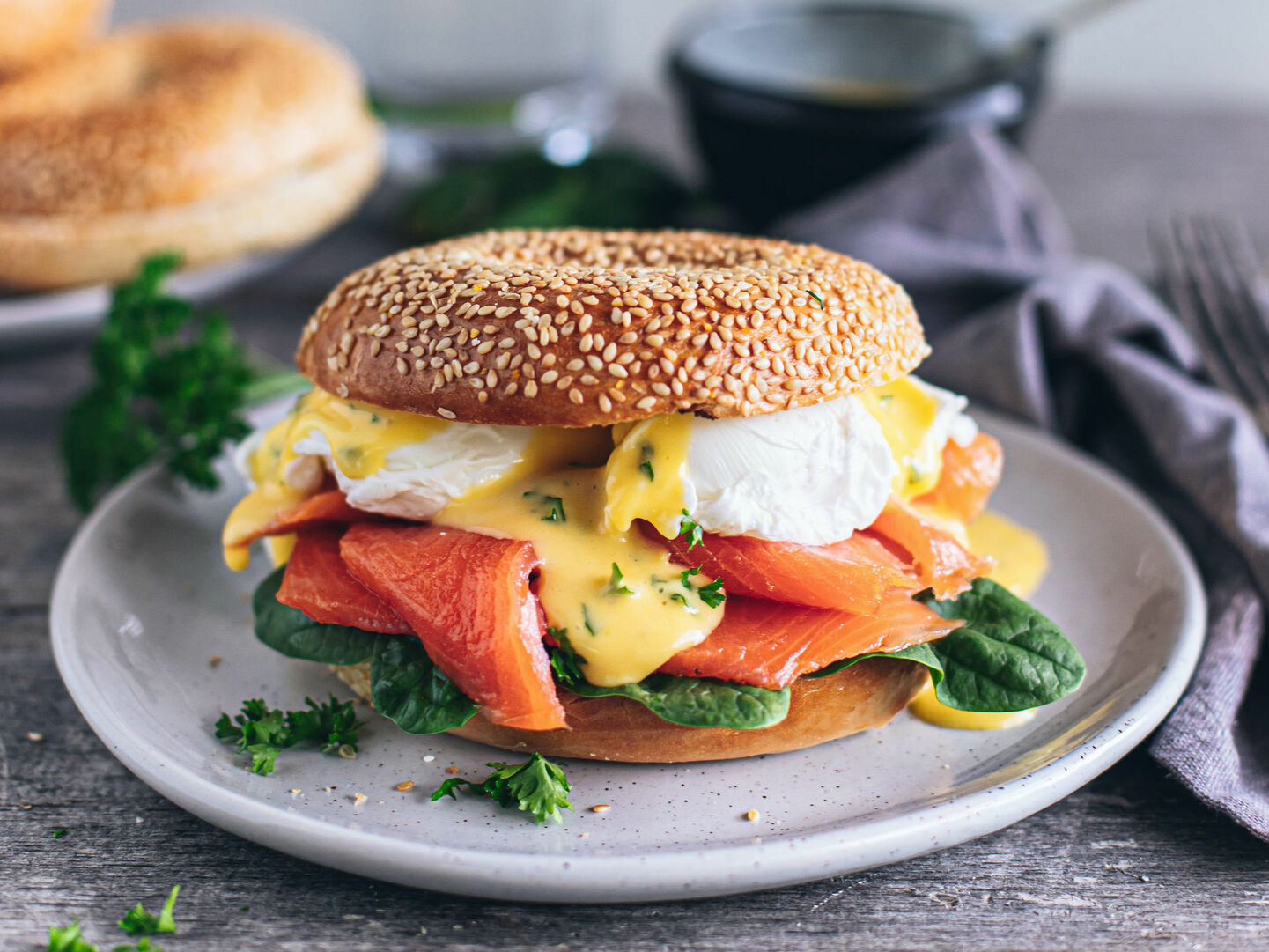 Up your brunch game with the Bagel Eggs Bene. Smoked salmon, poached eggs, and herby hollandaise. What more could a breakfast bagel ask for.
