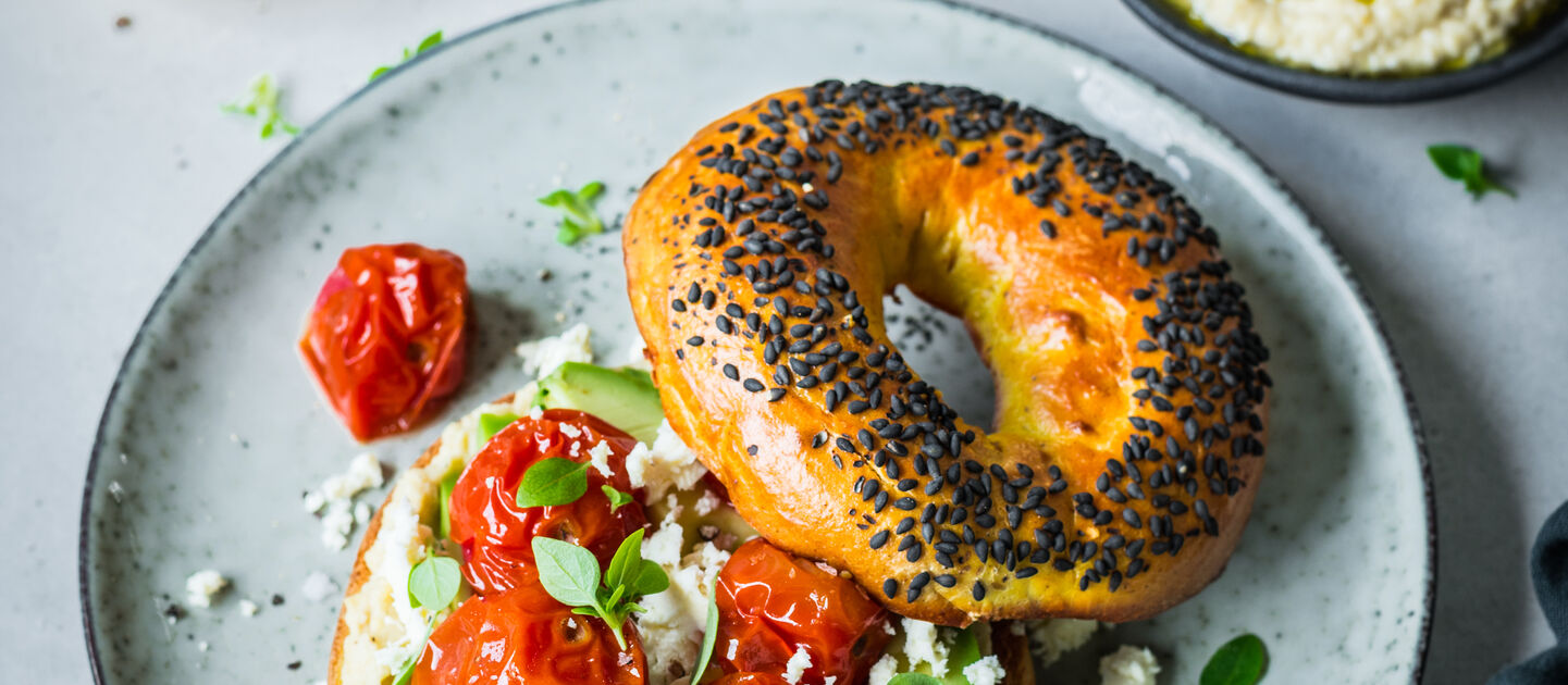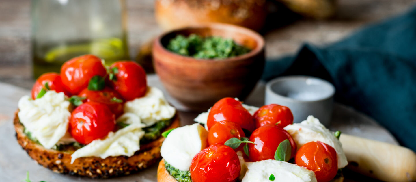 An ultimate trio. Roast cherry tomatoes, pesto & soft mozzarella balls. All perched atop our Everything Bagel. Need we say more?