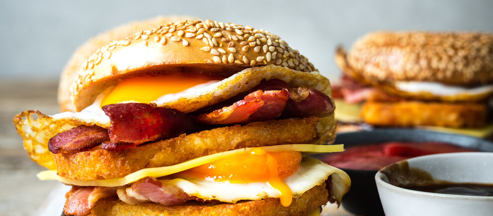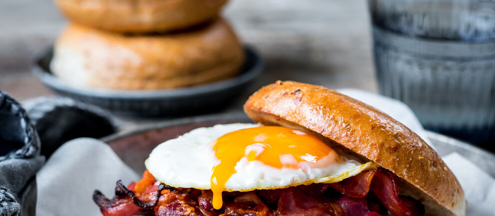 Spice up your brunch plans with this beast. We're talking streaky bacon, spicy kidney beans, Worcestershire sauce and a succulent fried egg. This bagel's sure to get the job done.