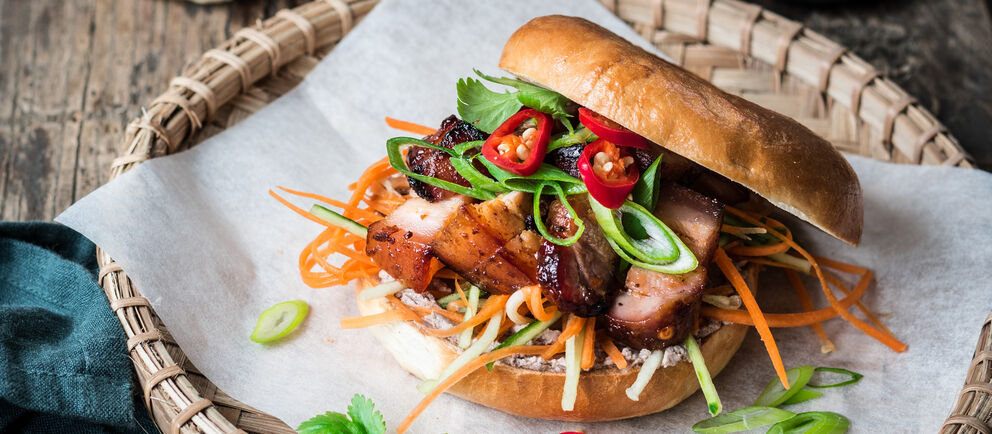 Feeling adventurous? We've got you covered. Sticky glazed pork, pickled carrot and cucumber, and chicken pâté. It's a yes from us.