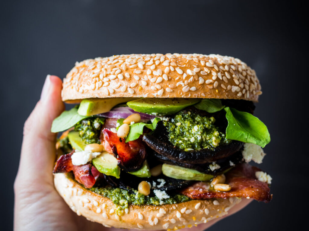 This bagel’s worth its weight in gold. We’re talking, avocado, pesto, Portobello mushrooms and bacon, all stacked between the Sesame Bagel. You’ll want to write this one down.
