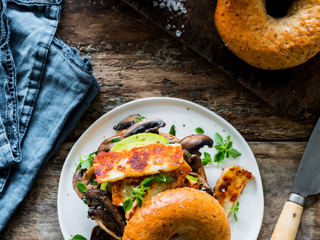 Lightly toast bagels, layer with wilted spinach, mushrooms, haloumi, and sliced avocado.